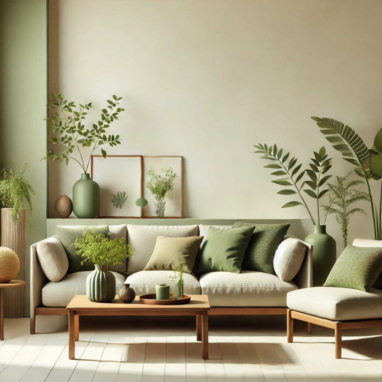 Waarom het werkt: Groen staat voor natuur en brengt een frisse, organische uitstraling in de ruimte. Gecombineerd met bruine en crèmekleurige accenten creëert het een harmonieuze en aardse sfeer.