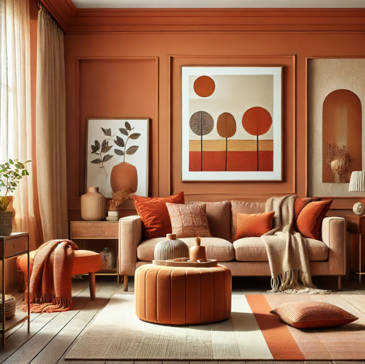 Waarom het werkt: Terracotta en warm oranje brengen een aardse, natuurlijke warmte in de kamer. Deze kleuren zijn rustgevend en uitnodigend, ideaal voor een gezellige woonkamer. Aardetinten zoals bruin en beige voegen een harmonieuze basis toe.