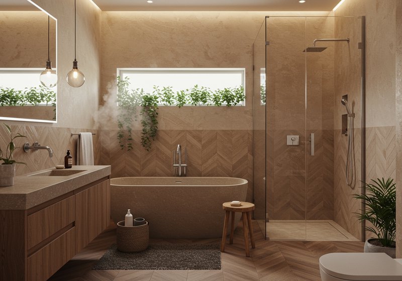 Ontdek biophilic design voor de badkamer: warme aardetinten, hout- en steenlooks, subtiele texturen, chevron-accenten en stoomproof planten. Zo maak je van je badkamer een rustige mini-spa.
