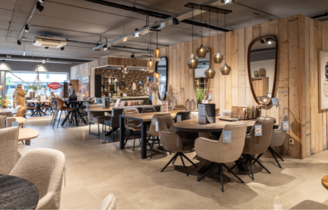 Onze showroom staat vol met een assortiment dat laat zien dat stijlvol niet duur hoeft te zijn. Van modern tot industrieel en van warm landelijk tot trendy combinaties: je ziet direct hoe meubels, kleuren en materialen samen een sfeervol geheel vormen.